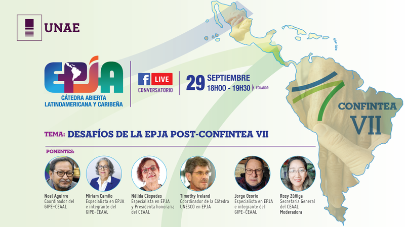La Cátedra Abierta Latinoamericana y Caribeña EPJA de la UNAE invita a participar de su 7mo encuentro del año 2022, denominado Desafíos de la EPJA Post-CONFINTEA VII, que se llevará a cabo hoy, 29 de septiembre, a las 18h00 (hora Ecuador), a través del Facebook Live de la Universidad Nacional de Educación. En este séptimo encuentro se contará con la presencia Rosy Zúñiga y Nélida Céspedes, de CEAAL; Noel Aguirre, Miriam Camilo y Jorge Osorio de GIPE-CEAAL; y Timothy Ireland, de la Cátedra UNESCO en EPJA.