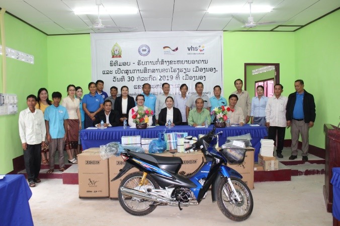 In cooperation with the Department of Non-formal Education of the Ministry of Education and Sports (MoES), DVV International supports the construction of a new building which functions as a Non-formal Education Center (NFEC) for Nong district. The handing-over ceremony of the new NFEC in Nong District has taken place on the 30th June 2019. The ceremony has been attended by representatives from the Department of Non-formal Education, Ministry of Education and Sports, the Deputy Director of the Savannakhet Provincial Education and Sports Service, the Deputy Governor of Nong District, the Regional Director of DVV International, the Manager of the Community Learning Center (CLC) and other related partners. At the ceremony, the DVV International has provided the new NFEC, as well as the CLCs, with office equipment and a motorbike.